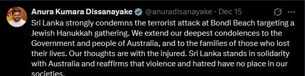 President Anura Kumara Dissanayake says that Sri Lanka strongly condemns the shooting that took place at Bondi Beach in Australia.