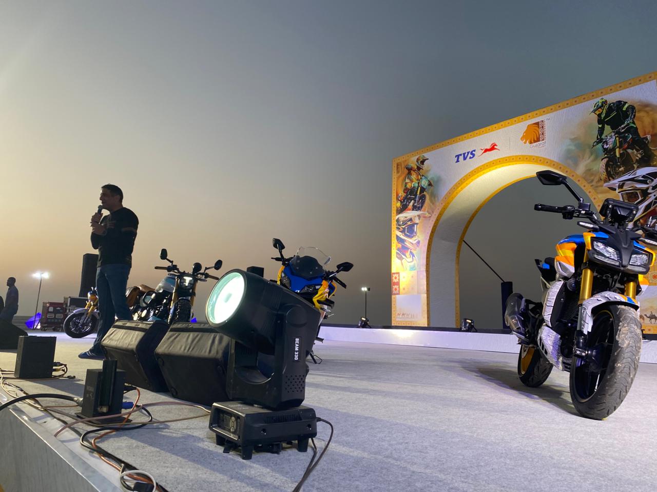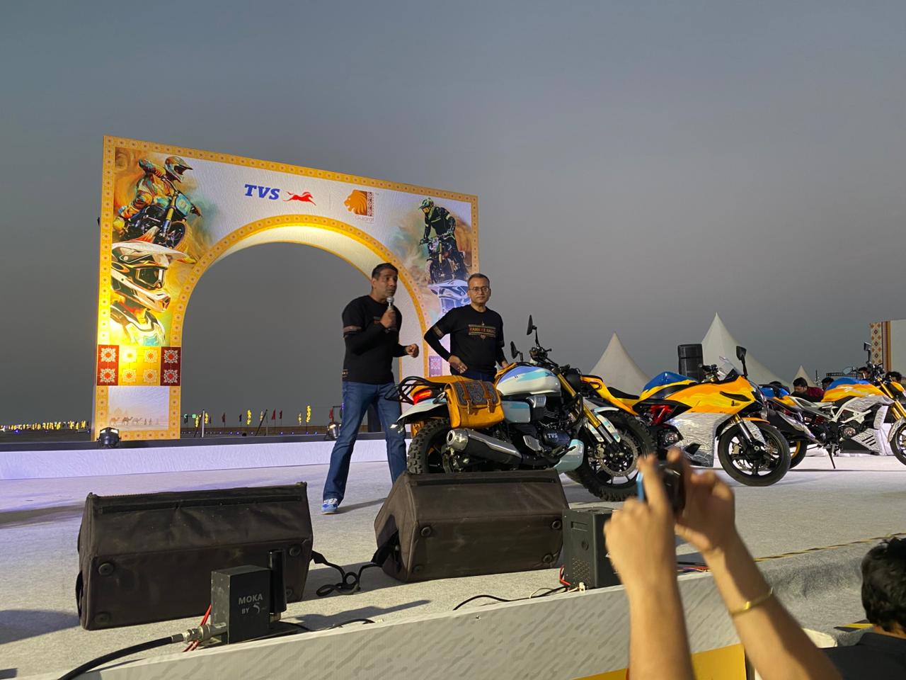 At the event, 05 TVS Apache and TVS Ronin motorcycles, colored in the beauty of the setting sun and the white salt land, were highlighted. and the traditional crafts of Rann of Kutch, Gujarat, were launched.