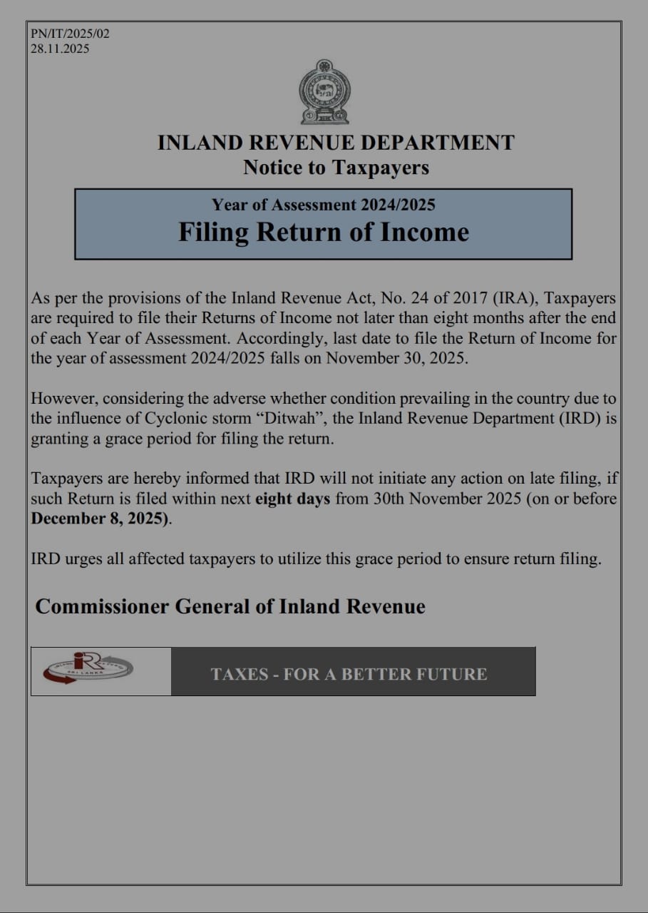 කෙසේ වෙතත් “දිට්වා” සුළි කුණාටුවේ බලපෑම හේතුවෙන් රට තුළ පවතින අහිතකර තත්ත්වය සැලකිල්ලට ගනිමින්, දේශීය ආදායම් දෙපාර්තමේන්තුව (IRD) විසින් අදාළ වාර්තා ගොනු කිරීම සඳහා සහන කාලයක් ලබා දීමට තීරණය කර තිබෙනවා.