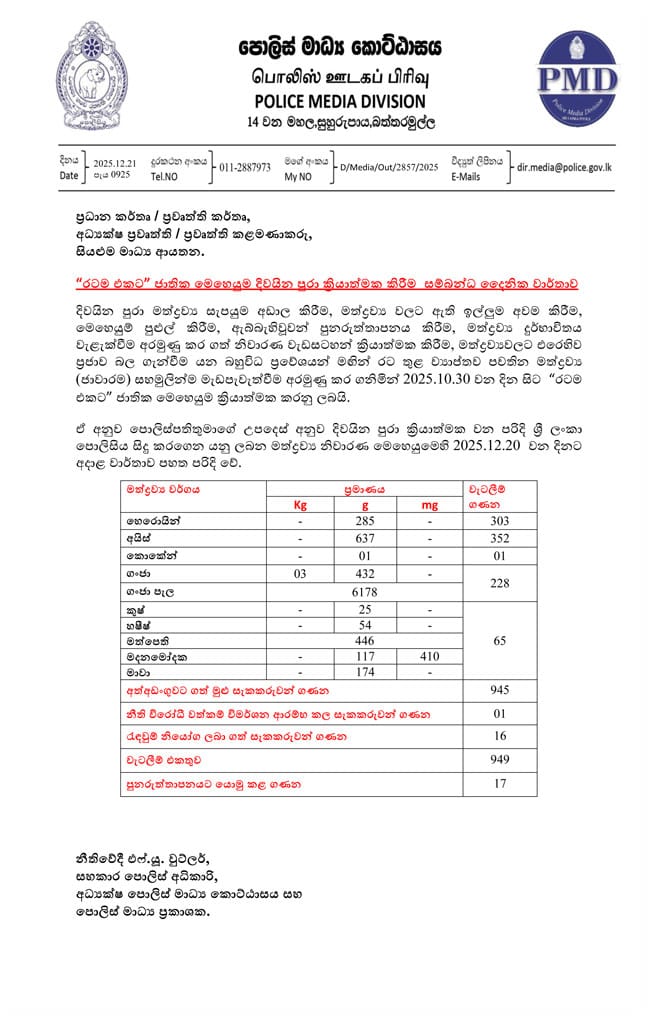 දිවයින පුරා මත්ද්රව්ය සැපයුම අඩාල කිරීම අරමුණු කරගත් 'රටම එකට' ජාතික මෙහෙයුමෙන් දෙසැම්බර් 20 දිනට සැකකරුවන් 945ක් අත්අඩංගුවට ගෙන තිබෙනවා.
