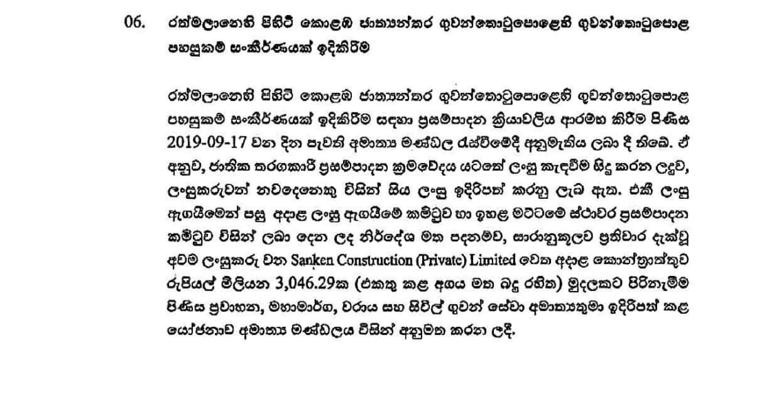රත්මලානෙහි පිහිටි කොළඹ ජාත්යන්තර ගුවන්තොටුපොළෙහි ගුවන්තොටුපොළ පහසුකම් සංකීර්ණයක් ඉදිකිරීම සඳහා ප්රසම්පාදන ක්රියාවලිය ආරම්භ කිරීම පිණිස 2019-09-17වනදා පැවති අමාත්ය මණ්ඩල රැස්වීමේදී අනුමැතිය ලබාදී තිබෙන බවයි සඳහන් වන්නේ.