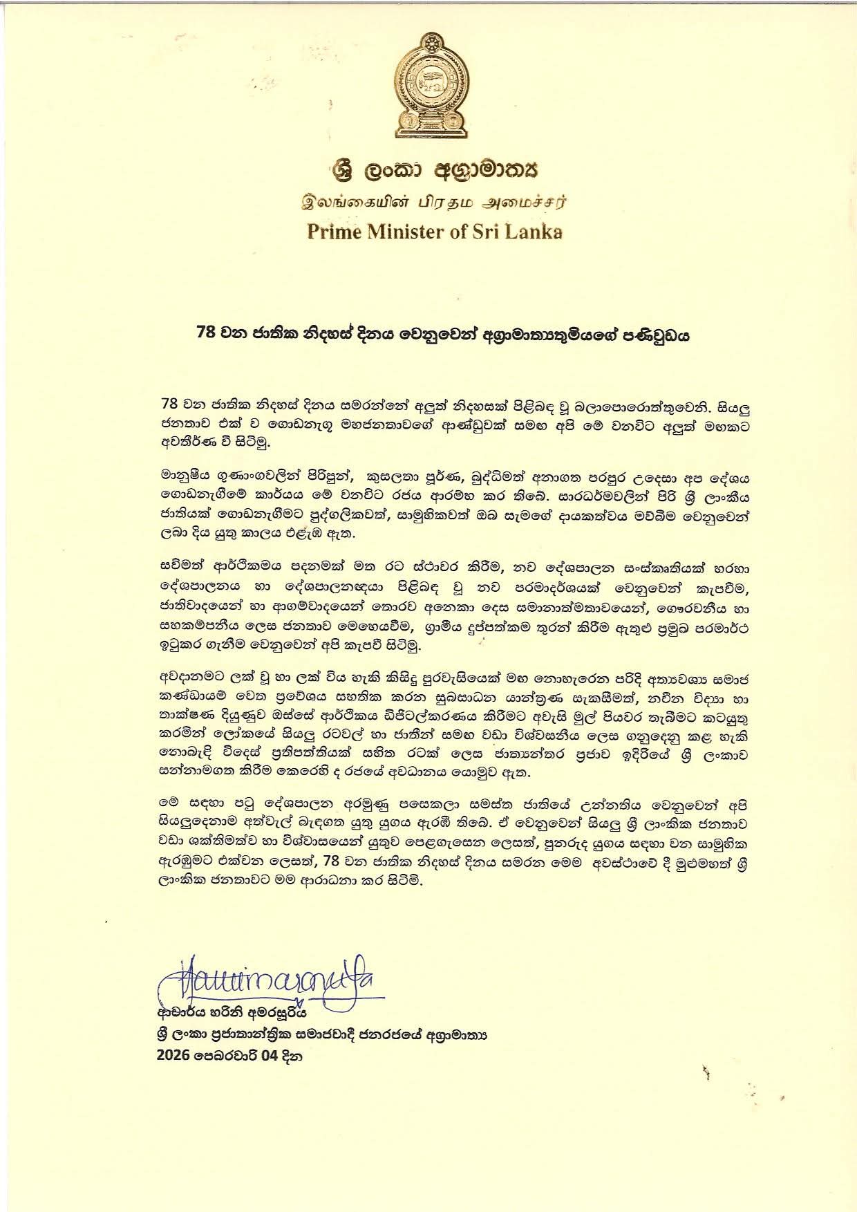 අග්රාමාත්ය ආචාර්ය හරිනි අමරසූරිය විසින් 78වන ජාතික නිදහස් සැමරුම සම්බන්ධයෙන් සුබ පැතුම් පණිවිඩයක් නිකුත් කර තිබෙනවා.