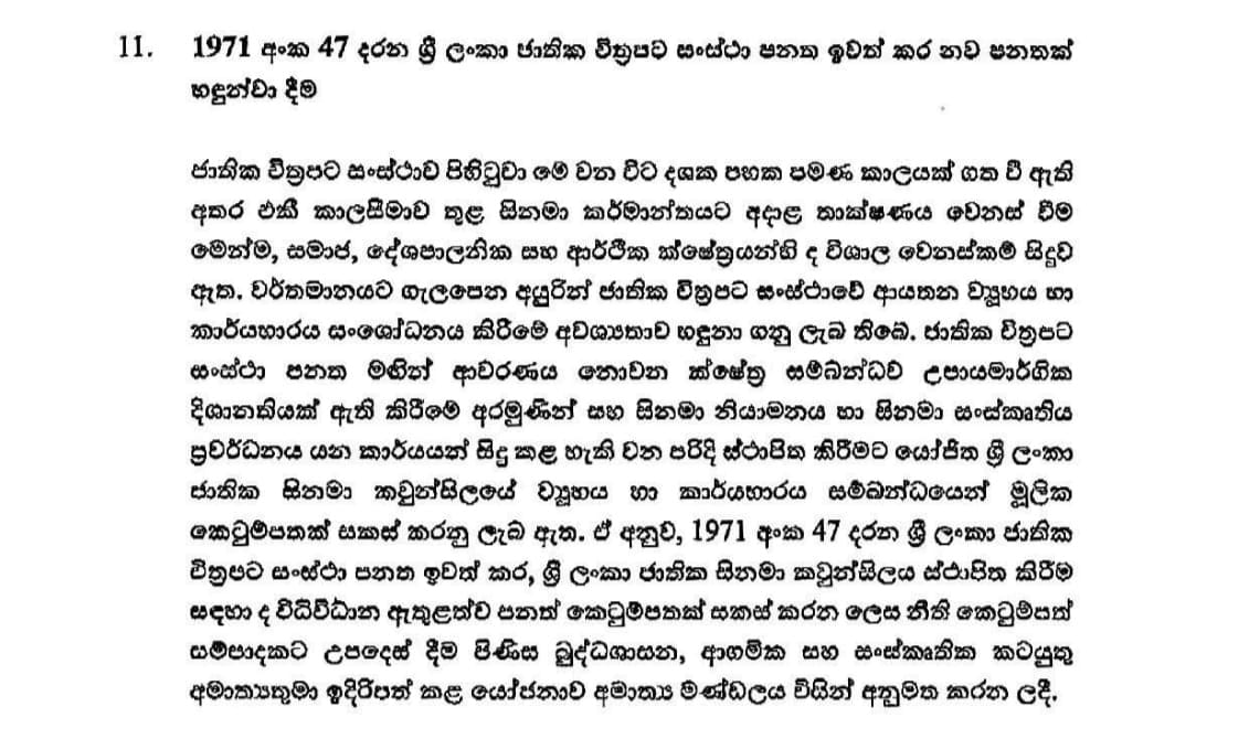 1971 අංක 47 දරන ශ්රී ලංකා ජාතික චිත්රපට සංස්ථා පනත ඉවත් කර නව පනතක් හඳුන්වාදීමට කැබිනට් අනුමැතිය හිමිවී තිබෙනවා.