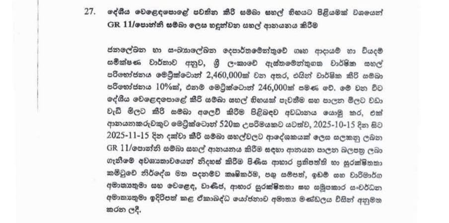 2025-10-15 දින සිට 2025-11-15 දින දක්වා කීරි සම්බා සහල්වලට ආදේශකයක් ලෙස (GR 11) පොන්නි සම්බා සහල් ආනයනය කිරීමට නියමිතව තිබෙනවා.