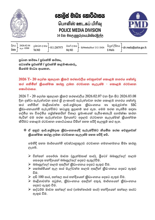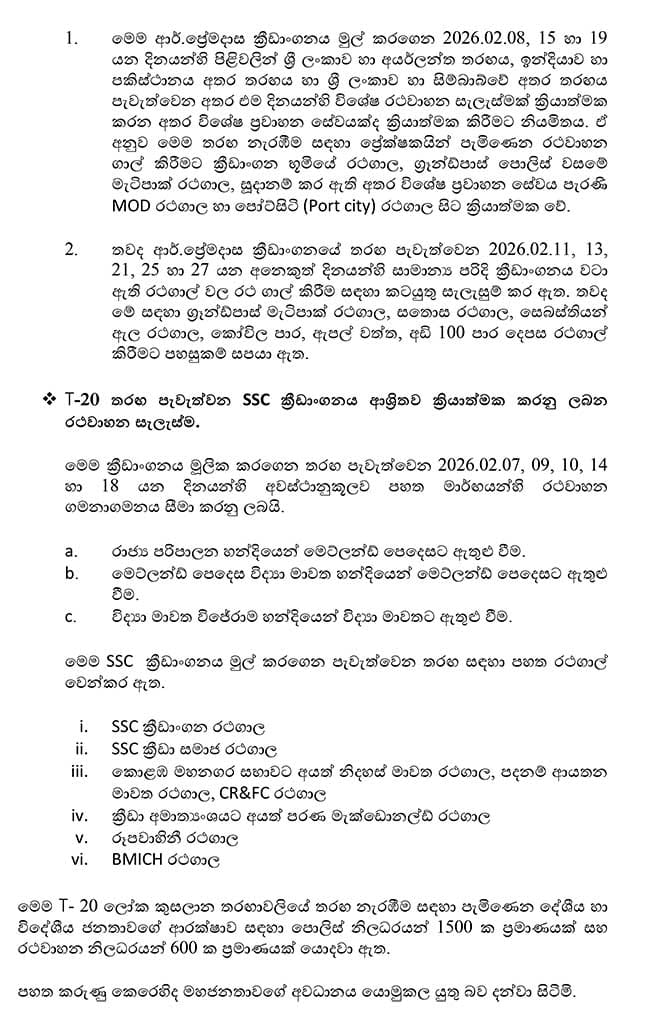 මාළිගාවත්ත ආර්. ප්රේමදාස ක්රීඩාංගණය සහ කුරුඳුවත්ත SSC ක්රීඩාංගණය අවට ප්රදේශයේ මෙම රථවාහන සැලැස්ම ක්රියාත්මක බව කොළඹ රථවාහන කොට්ඨාසය පවසනවා.