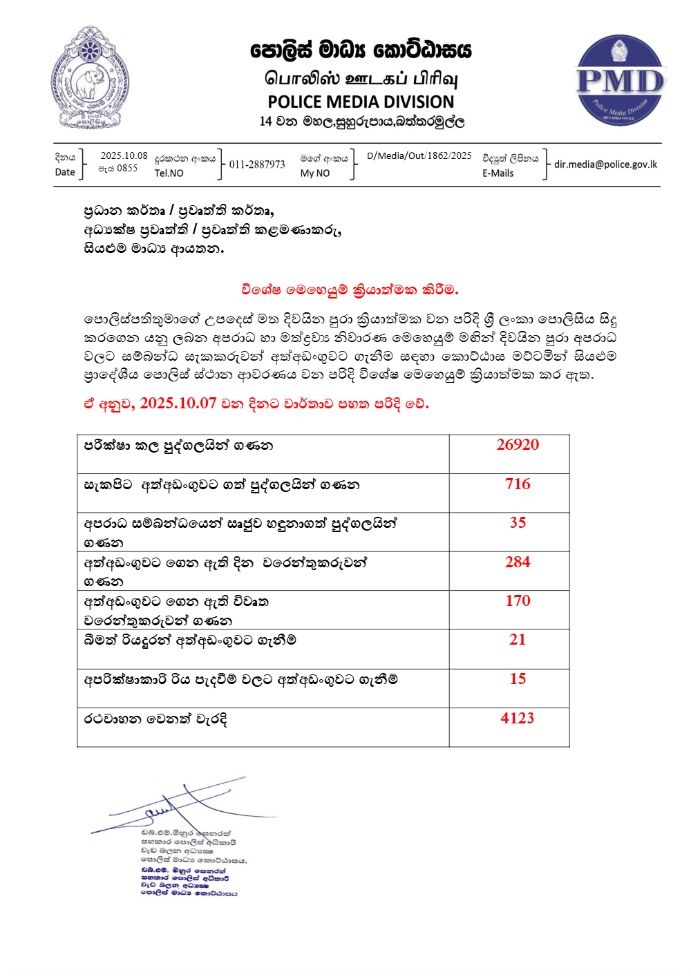 අපරාධ සහ මත්ද්රව්ය නිවාරණ මෙහෙයුම් යටතේ ඊයේ (07) පුද්ගලයන් 26,920ක් පරීක්ෂාවට ලක් කර තිබෙනවා.