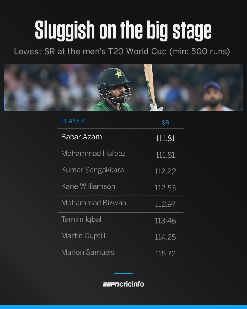 T20 ලෝක කුසලාන ක්රිකට් ඉතිහාසයේ ලකුණු 500කට වඩා ලබාගෙන ඇති පිතිකරුවන් අතරින් අඩුම ලකුණු වේගයක් පවත්වාගත් ක්රීඩකයා බවට බාබර් අසාම් වාර්තා අතරට එක්වී තිබෙනවා.