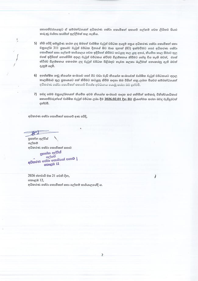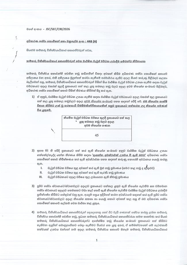 කම්කරු විනිශ්චයාධිකාර සභාපතිවරුන් වෙත වාර්ෂික වැටුප් වර්ධක ලබාදීම සම්බන්ධ නිර්නායක ඇතුළත් චක්රලේඛ නිකුත් කර තිබෙනවා. මෙම චක්රලේඛය අධිකරණ සේවා කොමිෂන් සභාව විසින් පසුගිය 21වනදා නිකුත් කර තිබෙන බවයි වාර්තා වන්නේ.(colombotimes.lk)
