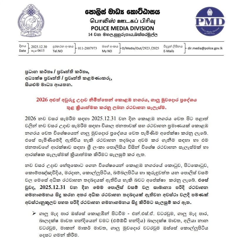 කොළඹ නගරය ආශ්රිතව හෙට (31) විශේෂ ආරක්ෂක හා රථ වාහන සැලැස්මක් ක්රියාත්මක කර තිබෙන බව පොලීසිය පවසනවා.