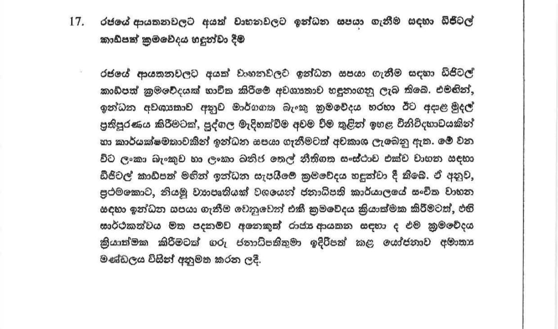 රජයේ ආයතනවලට අයත් වාහනවලට ඉන්ධන සපයා ගැනීම සඳහා ඩිජිටල් කාඩපත් ක්රමවේදය හඳුන්වාදීමට ජනාධිපතිවරයා ඉදිරිපත් කළ යෝජනාව අමාත්ය මණ්ඩලය විසින් අනුමත කර තිබෙනවා.