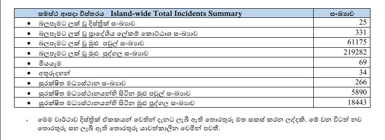 එම මධ්යස්ථානය සඳහන් කළේ ආපදා හේතුවෙන් පුද්ගලයන් 34දෙනෙක් අතුරුදන්ව ඇති අතර පවුල් 61,175කට අයත් පුද්ගලයන් 219,282ක් ආපදාවට ලක්ව ඇති බවයි.