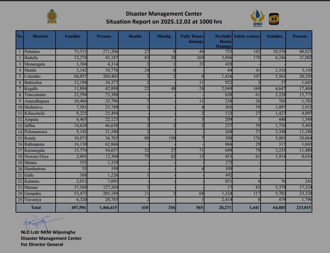 මුළු දිවයිනටම බලපෑ ආපදා තත්ත්වය හේතුවෙන් සිදු වූ ආපදා මරණ සංඛ්යාව 410ක් දක්වා ඉහළ ගොස් තිබෙන බව ආපදා කළමණාකරණ මධ්යස්ථානය පවසනවා.