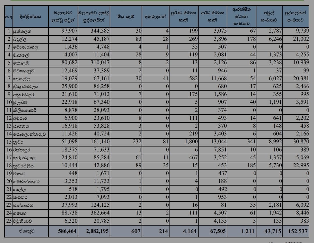 එමෙන්ම පවුල් 43,715ක පුද්ගලයන් 152,537ක් තවමත් සුරක්ෂිත මධ්යස්ථානයන්හී රැඳී සිටින බව ආපදා කළමනාකරණ මධ්යස්ථානය වැඩිදුරටත් සඳහන් කළා.