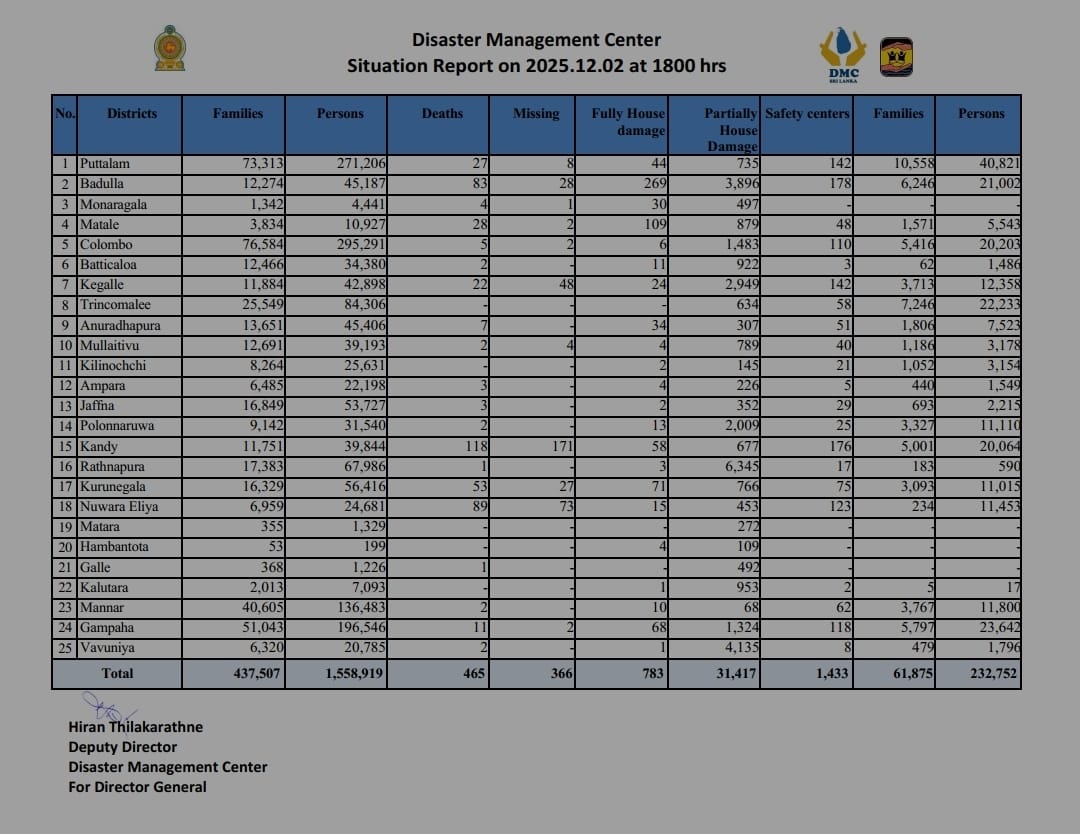 මුළු දිවයිනටම බලපා ඇති ආපදා තත්ත්වය හේතුවෙන් සිදු වූ ආපදා මරණ සංඛ්යාව 465ක් දක්වා ඉහළ ගොස් ඇති බව ආපදා කළමණාකරණ මධ්යස්ථානය පවසනවා.