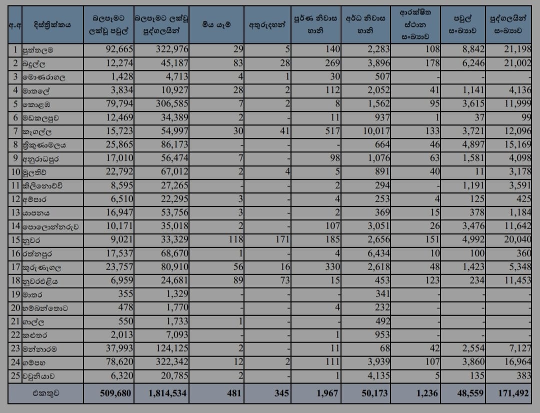 එමෙන්ම පවුල් 48,559ක පුද්ගලයන් 171,492ක් තවමත් සුරක්ෂිත මධ්යස්ථානයන්හී රැඳී සිටින බවද ආපදා කළමනාකරණ මධ්යස්ථානය වැඩිදුරටත් සඳහන් කළා.