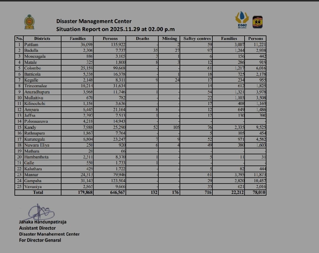 එමෙන්ම මේ වන විට දිස්ත්රික්ක 25කට අයත් පවුල් 179,868ක පුද්ගලයන් 646,567දෙනෙක් ආපදාවට ලක්වී තිබෙනවා.