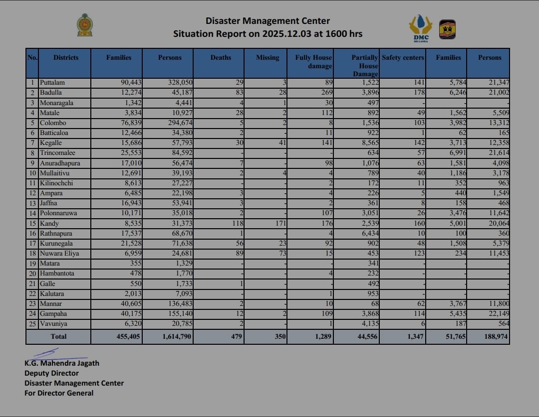 මුළු දිවයිනටම බලපෑ අයහපත් කාලගුණ තත්ත්වය හේතුවෙන් සිදු වූ ආපදා මරණ සංඛ්යාව 479ක් දක්වා ඉහළ ගොස් තිබෙන බව ආපදා කළමනාකරණ මධ්යස්ථානය පවසනවා.එම මධ්යස්ථානය සඳහන් කළේ එමෙන්ම පුද්ගලයන් 350දෙනෙක් අතුරුදන් වී තිබෙන බවයි.(colombotimes.lk)