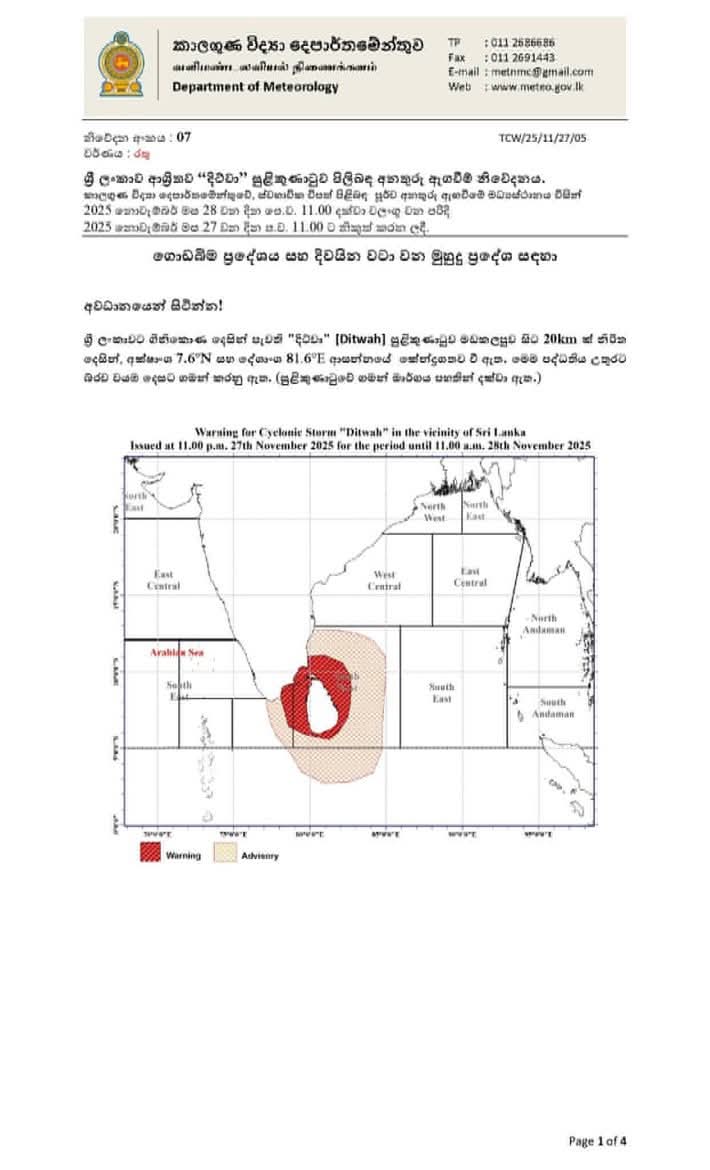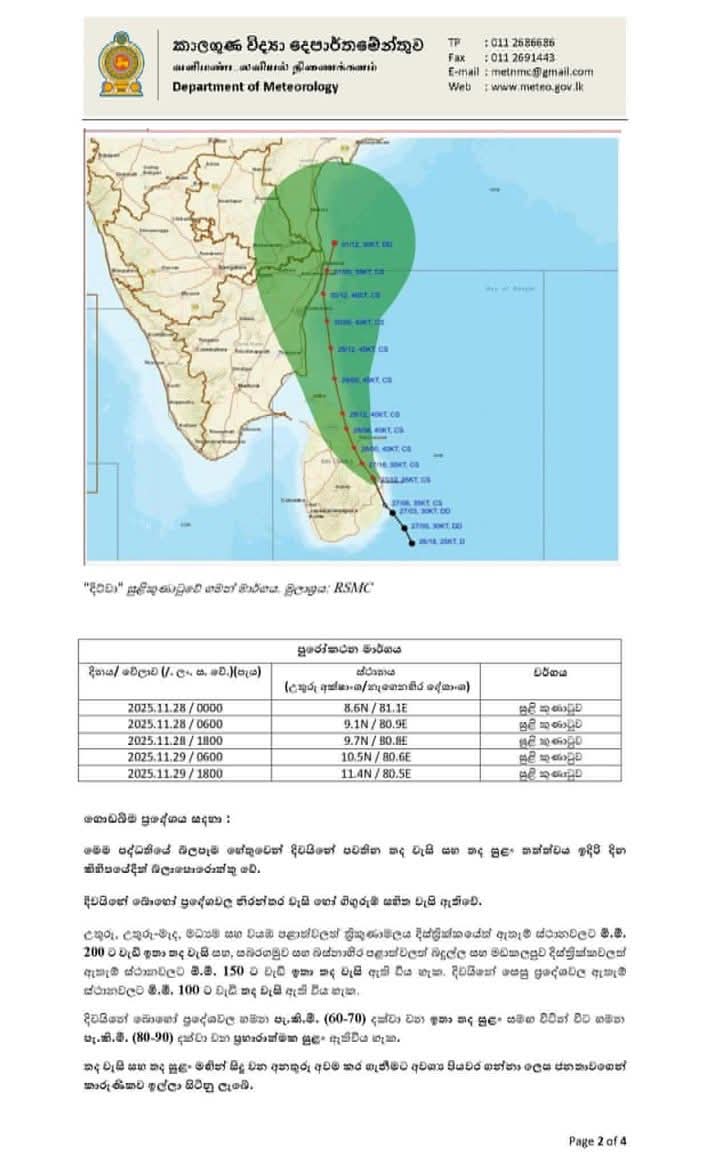 ශ්රී ලංකාවට ගිනිකොණ දෙසින් පැවති දිට්වා සුළි කුණාටුව මඩකලපුව සිට 20kmක් නිරිත දෙසින්, අක්ෂ 7.6°N සහ දේශාංශ 81.6°E ආසන්නයේ කේන්ද්රගතව වී තිබෙනවා.