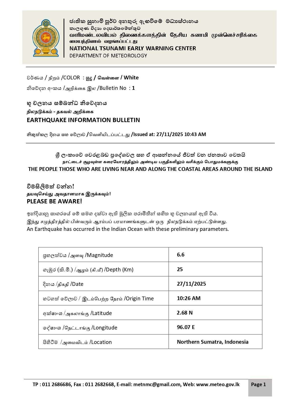ශ්රී ලංකාවේ වේලාවෙන් අද (27) උදෑසන 10.26ට මෙම භූකම්පනය හටගෙන තිබෙන බවයි වාර්තා වන්නේ.
