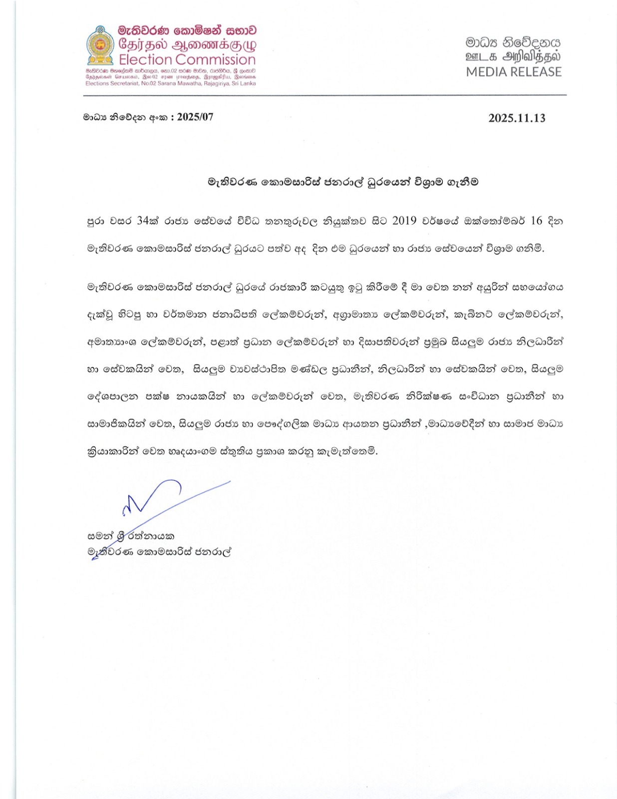 ඔහුගේ විශ්රාම ගැනීම පිළිබඳව මැතිවරණ කොමිෂන් සභාව විසින් නිකුත් කළ නිවේදනය පහතින්,