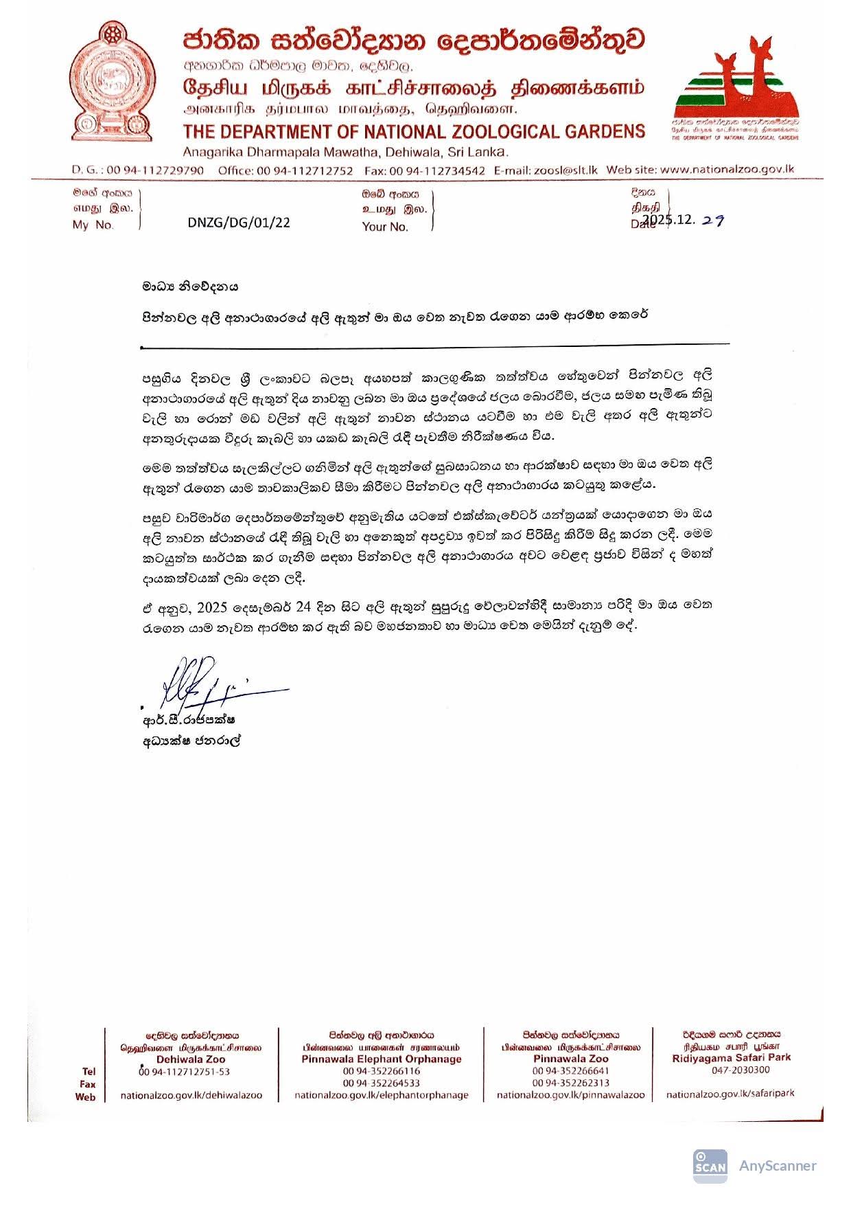 මේ පිළිබඳව ජාතික සත්වෝද්යාන දෙපාර්තමේන්තුව විසින් නිකුත් කළ නිවේදනය පහතින්,
