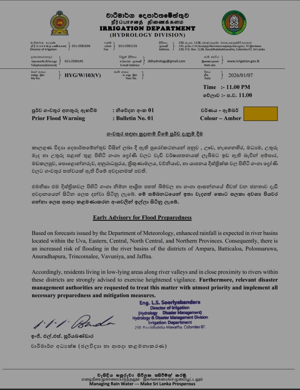 අම්පාර, මඩකලපුව, පොළොන්නරුව, අනුරාධපුරය, ත්රිකුණාමලය, වව්නියාව සහ යාපනය දිස්ත්රික්කවල පිහිටි ගංගා ද්රෝණිවලට ගංවතුර තත්ත්වයක් ඇතිවීමේ අවදානමක් පවතින බව වාරිමාර්ග දෙපාර්තමේන්තුව පවසනවා.
