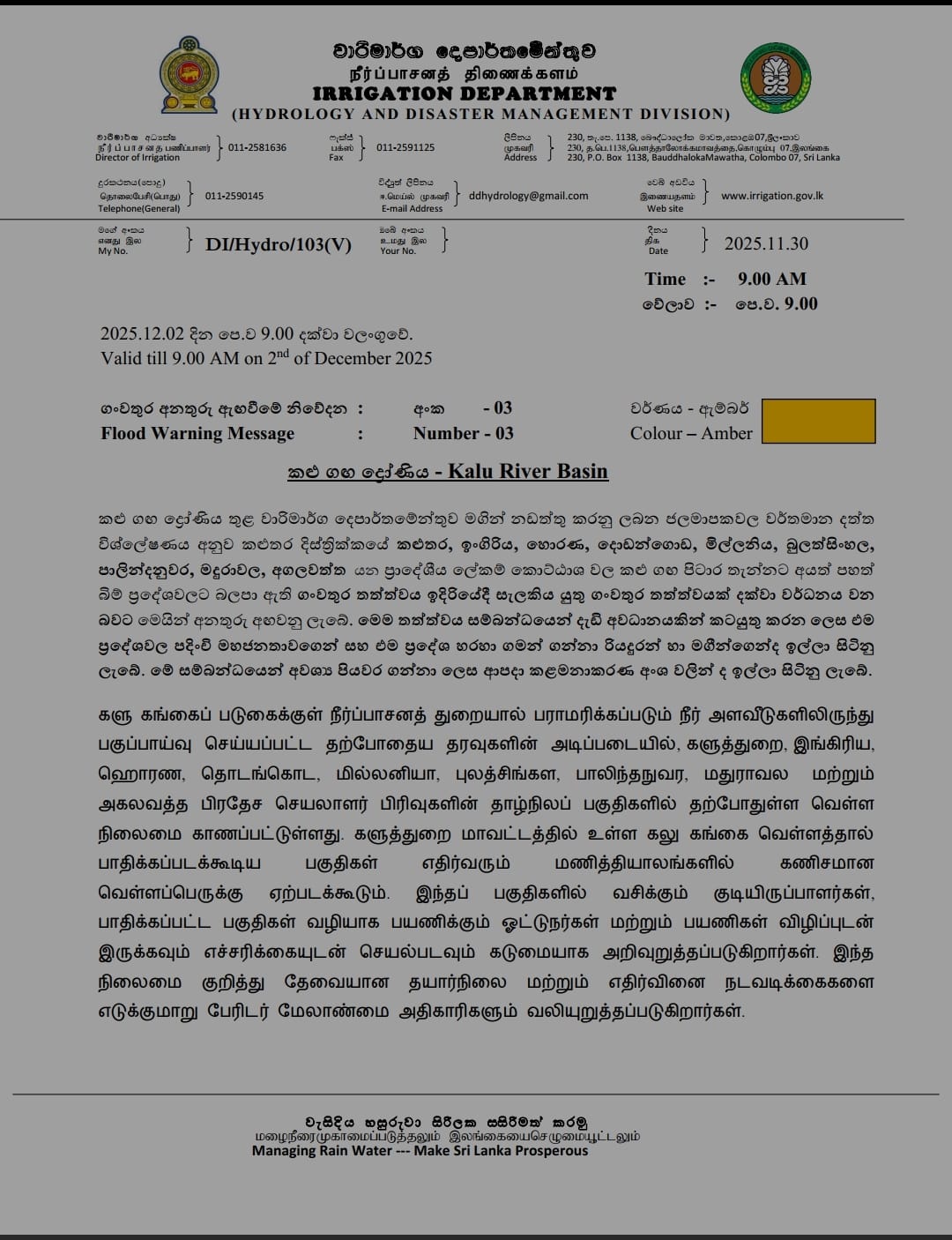 කළුතර දිස්ත්රික්කයේ කළුතර, ඉංගිරිය, හොරණ, දොඩන්ගොඩ, මිල්ලනිය, බුලත්සිංහල, පාලින්දනුවර, මදුරාවල, අගලවත්ත යන ප්රාදේශීය ලේකම් කොට්ඨාසවල කළු ගඟ පිටාර තැන්නට අයත් පහත්බිම් ප්රදේශවලට බලපා තිබෙන ගංවතුර තත්ත්වය ඉදිරියේදී සැලකිය යුතු ගංවතුර තත්ත්වයක් දක්වා වර්ධනය වීමට හැකියාව පවතින බව වාරි මාර්ග දෙපාර්තමේන්තුව නිවේදනයක් නිකුත් කරමින් සඳහන් කළා.