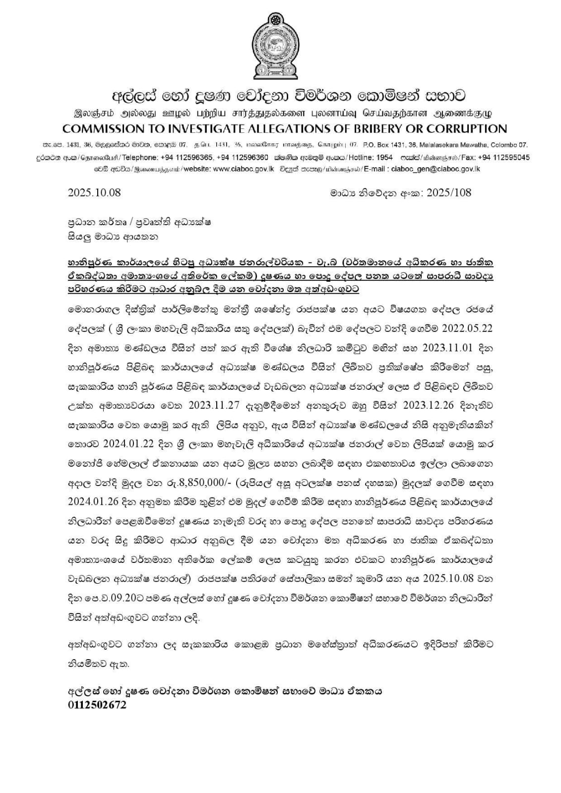 ඒ අල්ලස් හෝ දූෂණ චෝදනා විමර්ශන කොමිෂන් සභාවේ නිලධාරීන් විසින්.