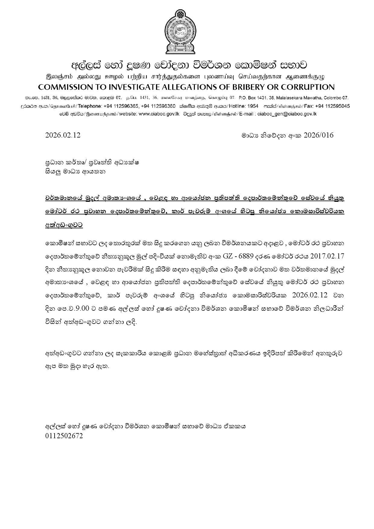 සැකකාරිය වාර්තමානයේ මුදල් අමාත්යාංශයේ වෙළෙඳ හා ආයෝජන ප්රතිපත්ති දෙපාර්තමේන්තුවේ සේවයේ නියුතු බව අල්ලස් හෝ දූෂණ චෝදනා විමර්ශන කොමිෂන් සභාව පවසනවා.