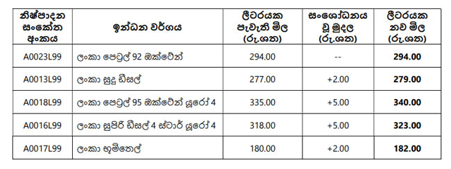 ඒ අනුව ලංකා සුදු ඩීසල් ලීටරයක් රුපියල් 2කින්, ඔක්ටේන් 95 පෙට්රල් ලීටරයක් රුපියල් 5කින්, ලංකා සුපිරි ඩීසල් ලීටරයක් රුපියල් 5කින් සහ ලංකා භූමිතෙල් ලීටරයක් රුපියල් 2කින් ඉහළ ගොස් තිබෙන බවයි සඳහන් වන්නේ.