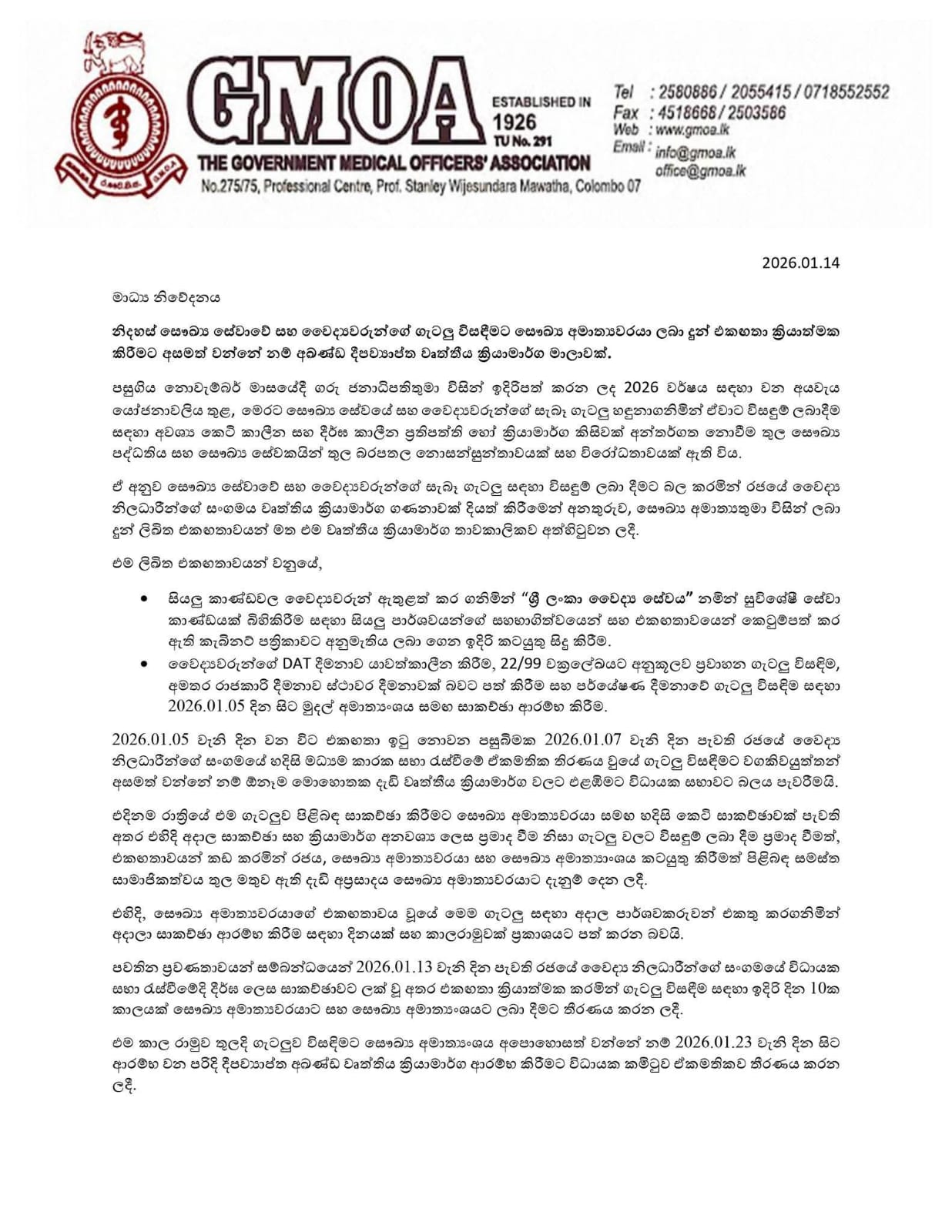 මේ පිළිබඳව රජයේ වෛද්ය නිලධාරීන්ගේ සංගමය නිකුත් කළ නිවේදනය පහතින්,