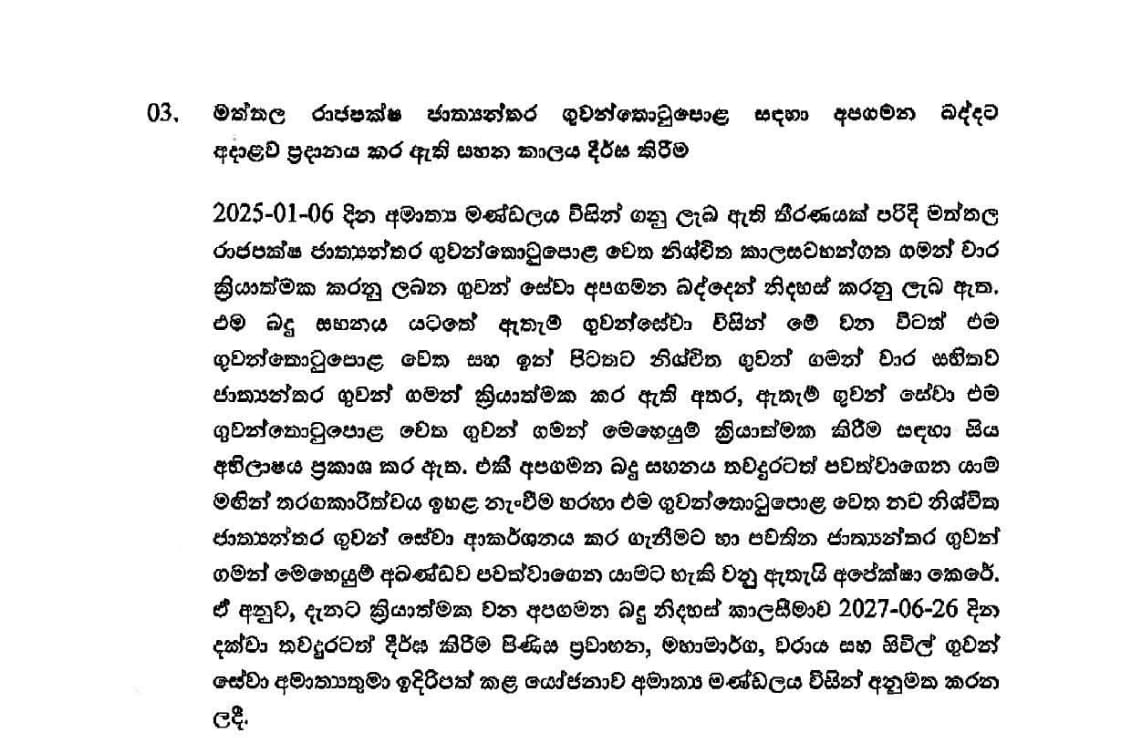 ඒ අනුව 2025-01–06 දින අමාත්ය මණ්ඩලය විසින් ගත් තීරණයක් පරිදි මත්තල රාජපක්ෂ ජාත්යන්තර ගුවන්තොටුපළ වෙත නිශ්චිත කාලසටහනකට අනුව ගමන් වාර ක්රියාත්මක කරන ගුවන් සේවා අපගමන බද්දෙන් නිදහස් කර තිබෙන බවයි වාර්තා වන්නේ.