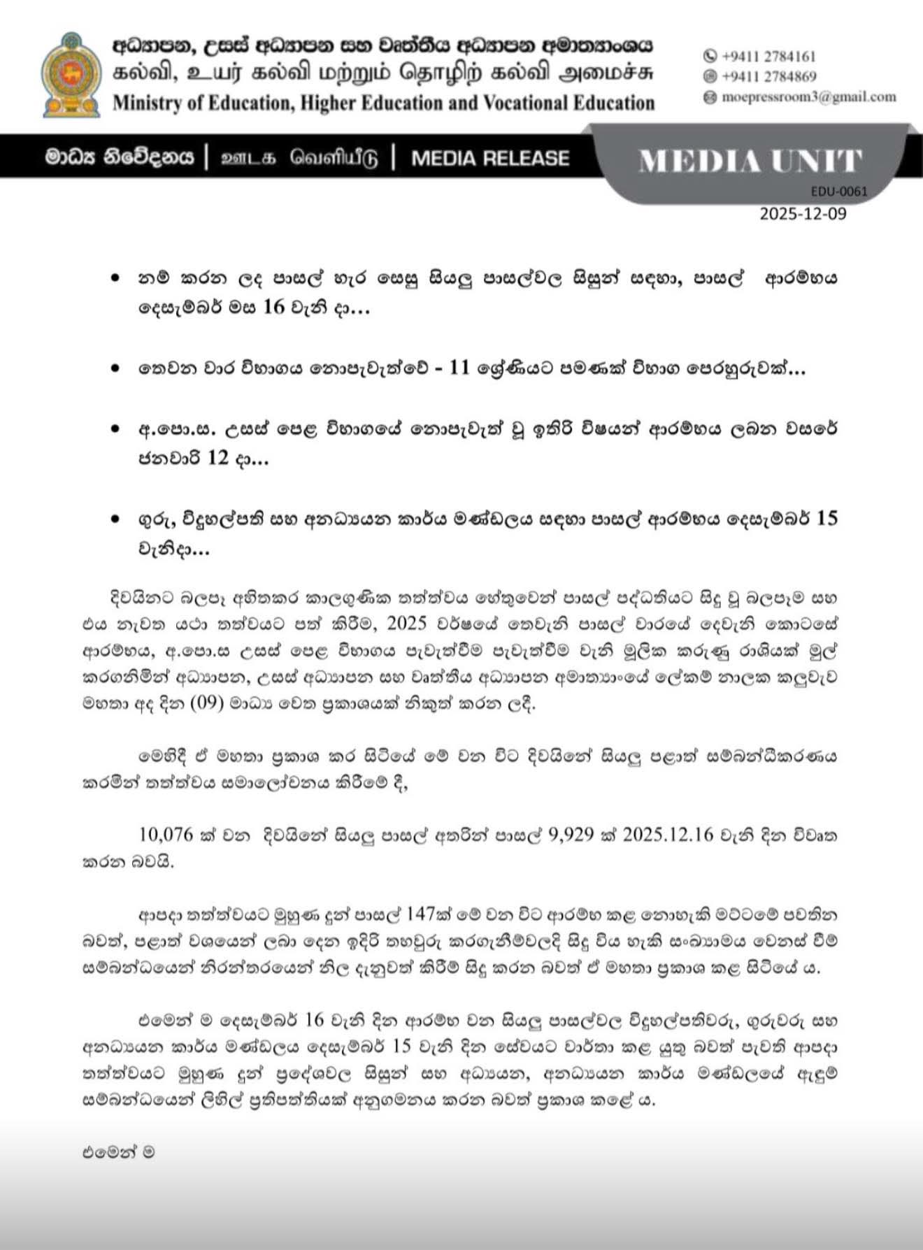 අධ්යයන පොදු සහතික පත්ර උසස් පෙළ විභාගයේ නොපැවැත්වූ විෂයන් පැවැත්වෙන දිනයන් විභාග දෙපාර්තමේන්තුව විසින් නිවේදනයක් නිකුත් කරමින් සඳහන් කළා. එම දෙපාර්තමේන්තුව සඳහන් කළේ එළඹෙන ජනවාරි 12වනදා එම විෂයන් නැවත ආරම්භ කරන බවයි. (colombotimes.lk)