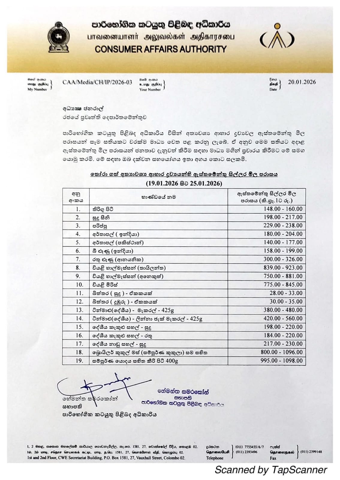අත්යාවශ්ය ආහාර ද්රව්යවල ඇස්තමේන්තු මිල පරාසයන් පාරිභෝගික කටයුතු පිළිබඳ අධිකාරිය විසින් නිකුත් කර තිබෙනවා.ඒ අනුව මේ සතියට අදාළව නිකුත් කළ අත්යාවශ්ය ආහාර ද්රව්යවල ඇස්තමේන්තු මිල පරාසයන් පහතින්, (colombotimes.lk)