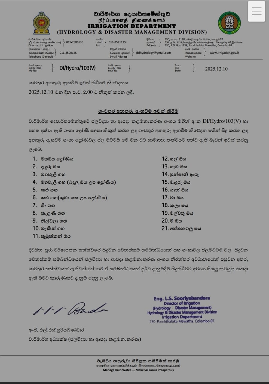 මේ පිළිබඳව වාරිමාර්ග දෙපාර්තමේන්තුව විසින් නිකුත් කළ නිවේදනය පහතින්,