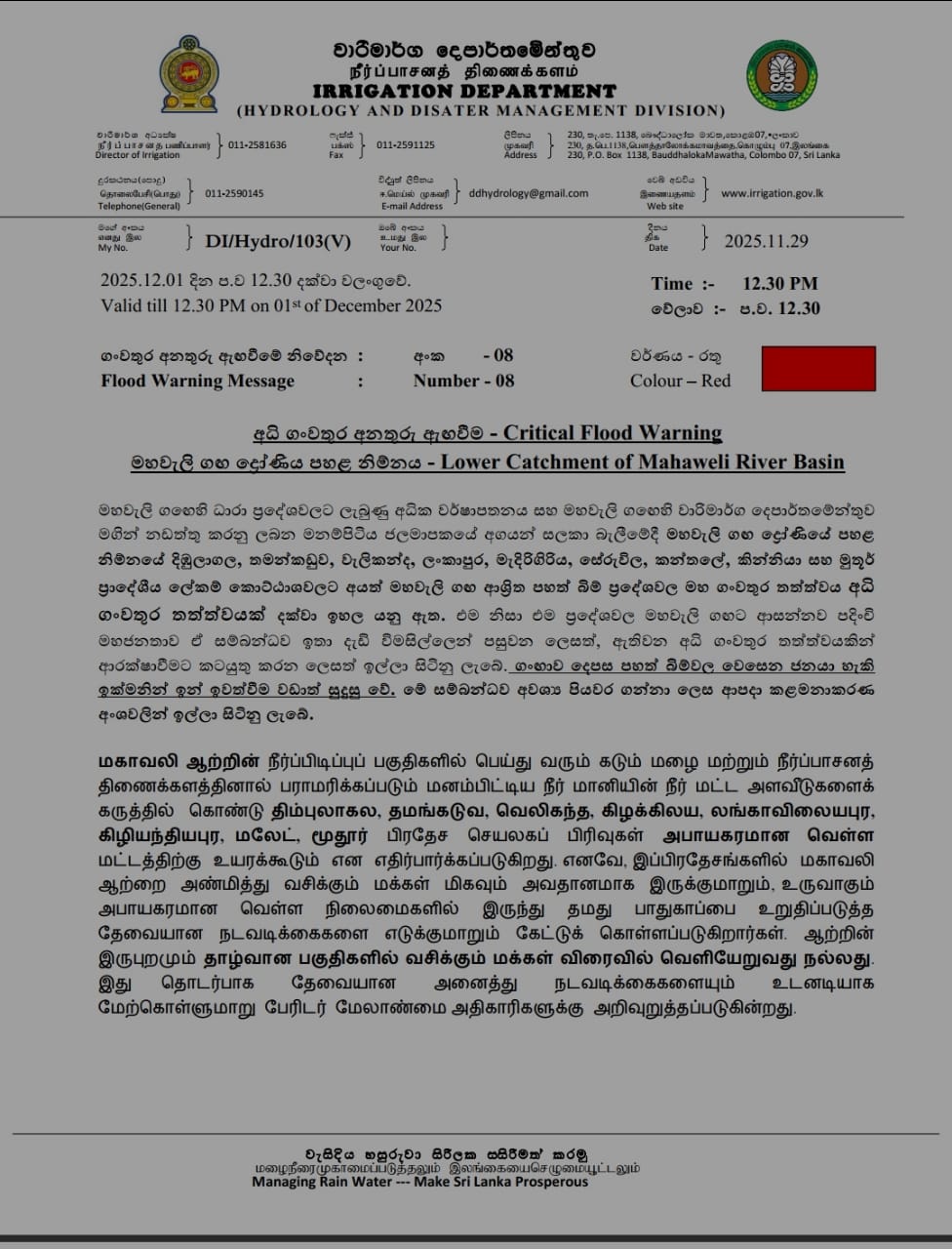 මහවැලි ගඟේ ධාරා ප්රදේශවලට ලැබුණු අධික වර්ෂාව හේතුවෙන් මහවැලි ගඟ ද්රෝණියේ පහළ නිම්නයේ පිහිටි ප්රදේශ රැසක පවතින ගංවතුර තත්ත්වය අධි ගංවතුර තත්ත්වයක් දක්වා ඉහළ යන බව වාරිමාර්ග දෙපාර්තමේන්තුව නිවේදනයක් නිකුත් කරමින් සඳහන් කළා.