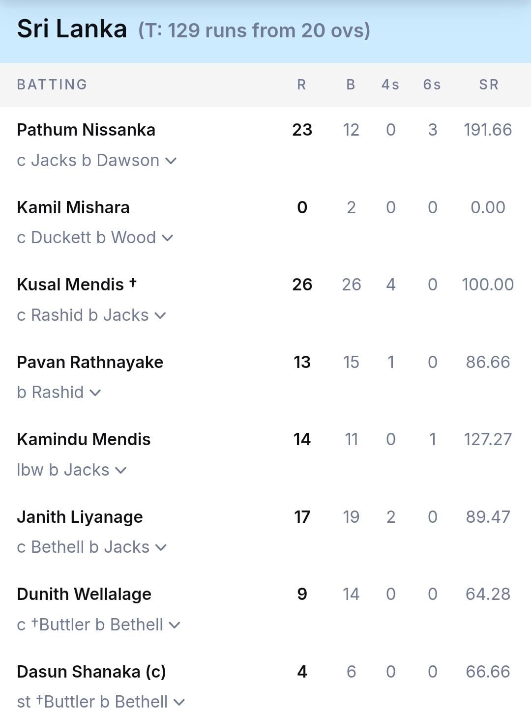 ඒ අනුව ශ්රී ලංකා කණ්ඩායමට වසර 12කට පසු එංගලන්තයට එරෙහිව T20 තරගයක් ජයග්රහණය කිරීම වෙනුවෙන් ලකුණු 129ක පහසු ඉලක්කයක් හිමි වුණා.
