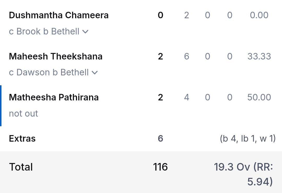 ඒ අනුව ඔවුන්ට සියලුදෙනා දැවී රැස් කර ගැනීමට හැකි වුණේ ලකුණු 116ක් පමණයි.