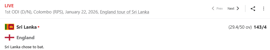 සංචාරක එංගලන්ත කණ්ඩායම සහ ශ්රී ලංකා කණ්ඩායම අතර පළමු එක්දින තරගය් මේ වන විට ආර්. ප්රේමදාස ක්රිකට් ක්රීඩාංගනයේදී පැවැත්වෙනවා.