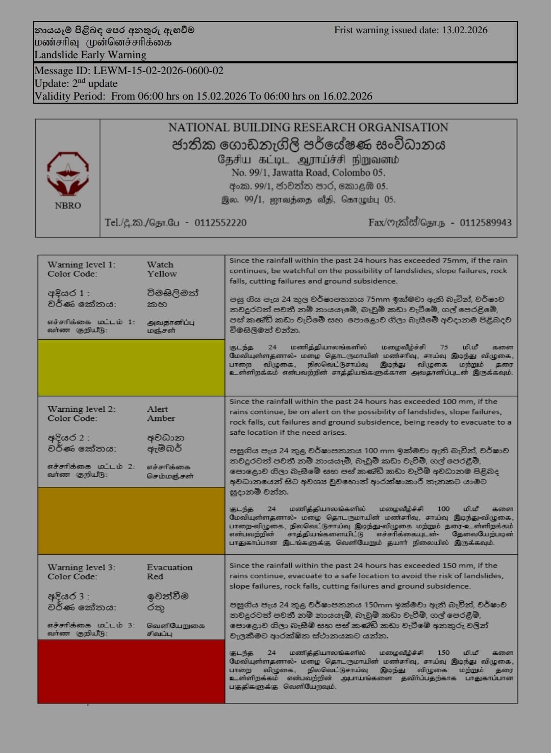 දිවයින පුරා පවතින වැසි සහිත කාලගුණික තත්ත්වයත් සමඟ නායයෑම් පූර්ව අනතුරු ඇඟවීමේ නිවේදනය යාවත්කාලීන කරමින් ජාතික ගොඩනැගිලි පර්යේෂණ සංවිධානය නිවේදනයක් නිකුත් කර තිබෙනවා.