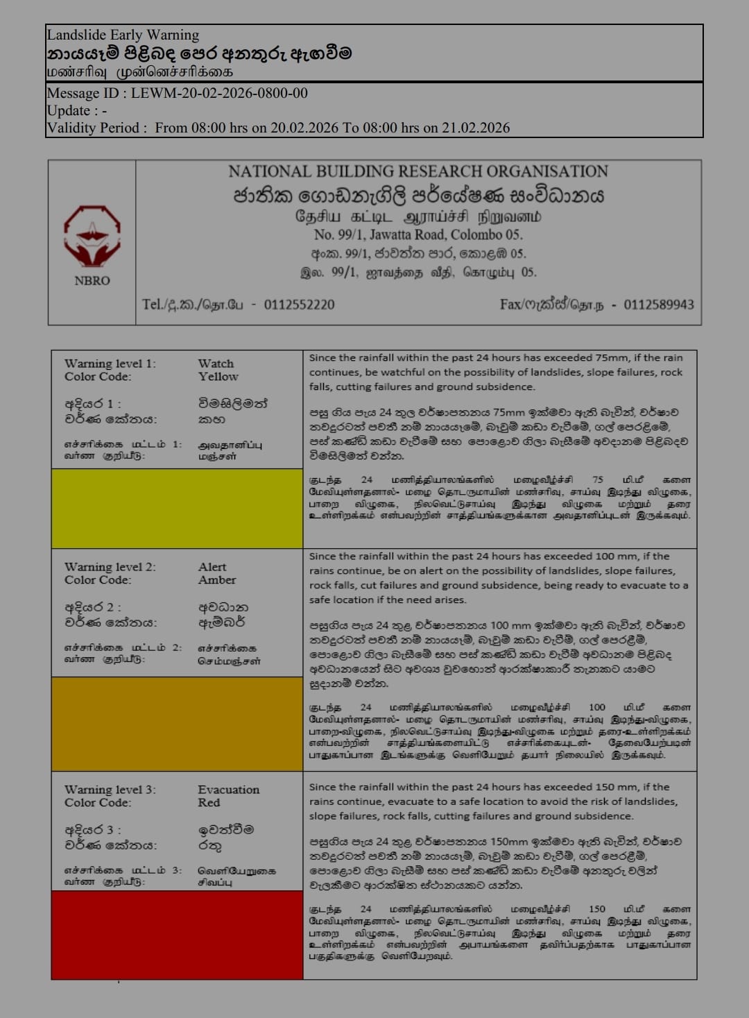 මීට අමතරව නුවරඑළිය දිස්ත්රික්කයේ මතුරට, හඟුරක්කෙත, බදුල්ල දිස්ත්රික්කයේ මීගහකිවුල සහ කන්දෙකැටිය යන ප්රාදේශීය ලේකම් කොට්ඨාස සඳහා විමසිලිමත්ව සිටින ලෙසත් ජාතික ගොඩනැගිලි පර්යේෂණ ආයතනය විසින් නිකුත් කළ නවතම නිවේදනයේ සඳහන් වනවා.