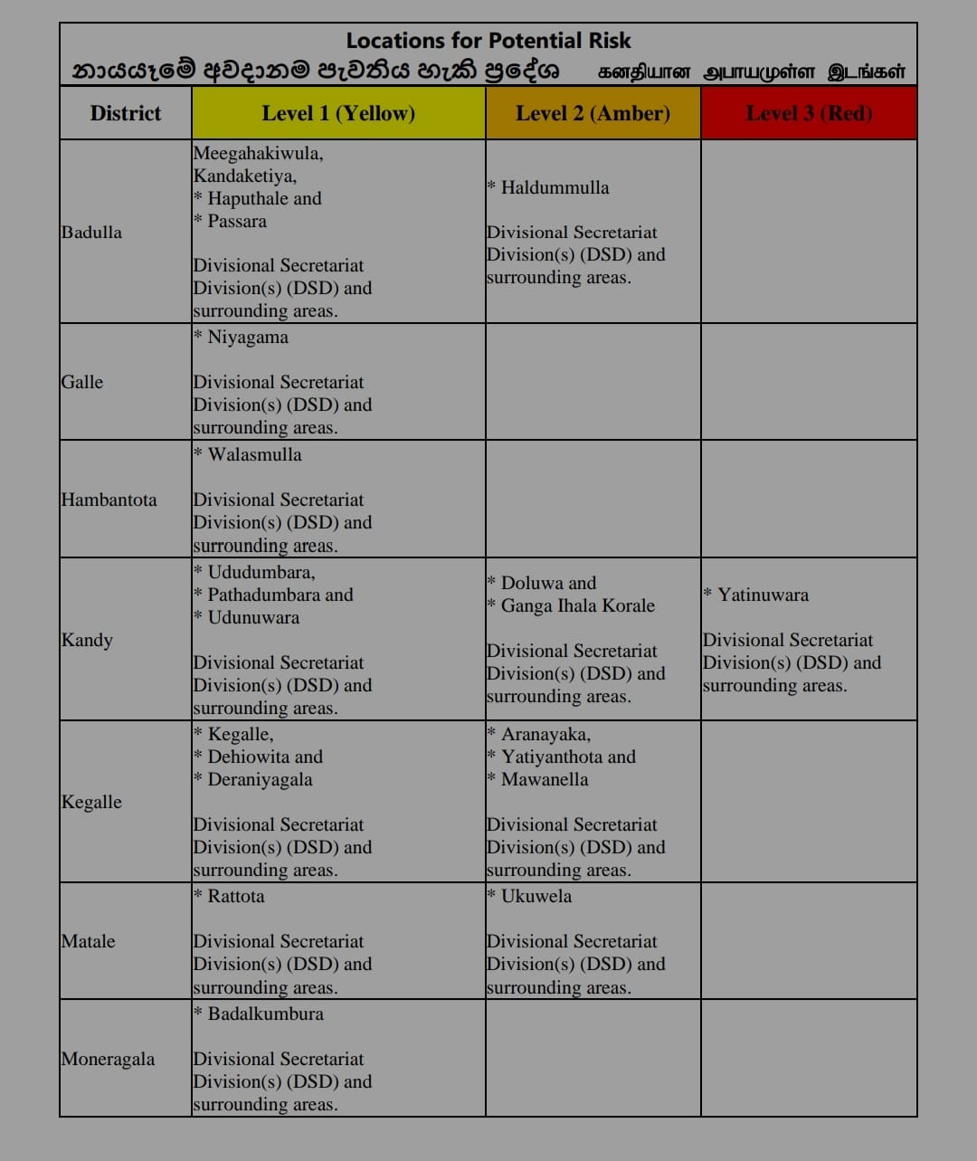 එම සංවිධානය සඳහන් කළේ මහනුවර දිස්ත්රික්කයේ යටිනුවර ප්රාදේශීය ලේකම් කොට්ඨාසය සඳහා නායයෑමේ 'රතු නිවේදන' හෙවත් 3වන මට්ටමේ ඉවත් වීමේ නිවේදන නිකුත් කළ බවයි.