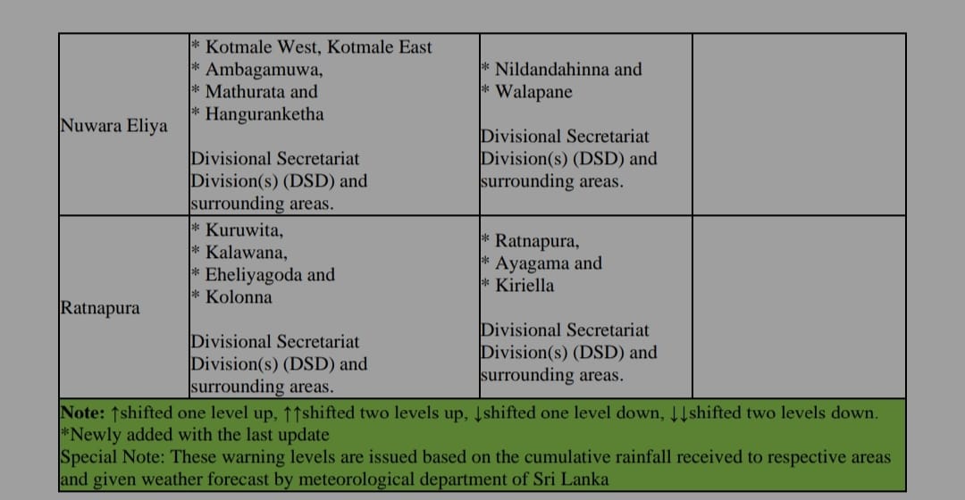 ජාතික ගොඩනැගිලි පර්යේෂණ සංවිධානය සඳහන් කළේ බදුල්ල, මහනුවර, කෑගල්ල, මාතලේ, නුවරඑළිය සහ රත්නපුර දිස්ත්රික්කවලට නායයෑමේ පූර්ව අනතුරු ඇඟවීම් නිකුත් කර තිබෙනවා.