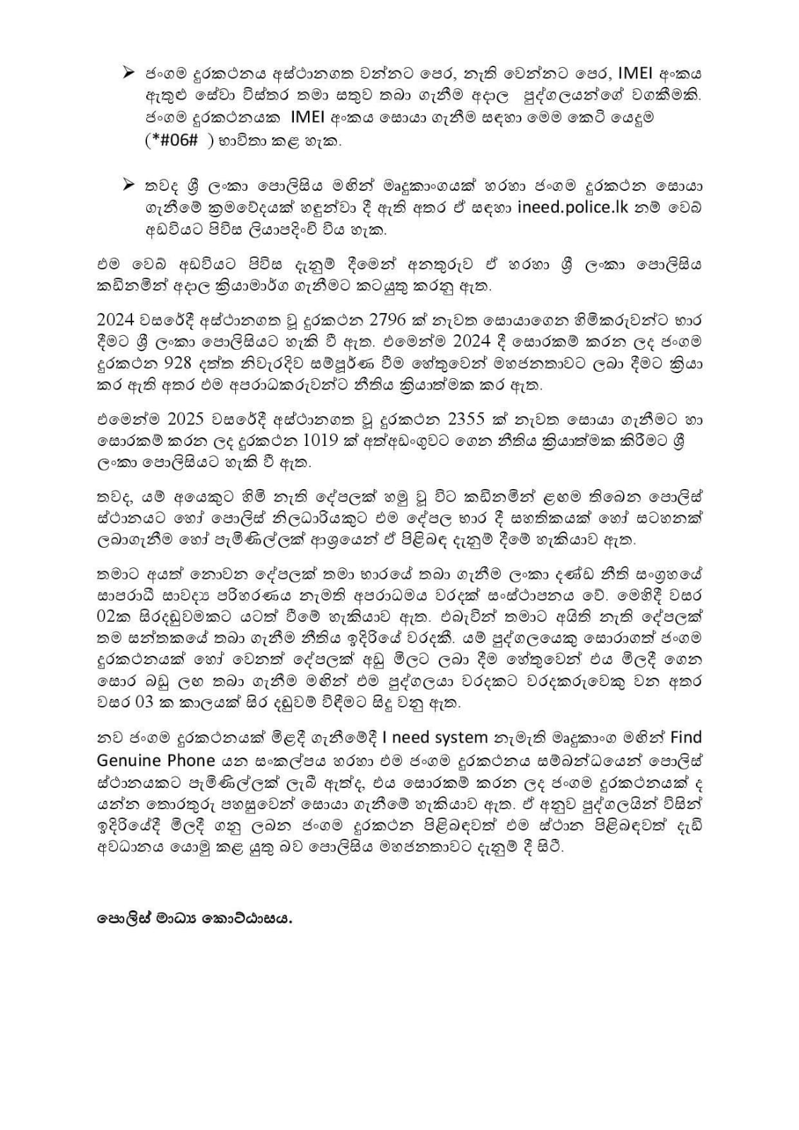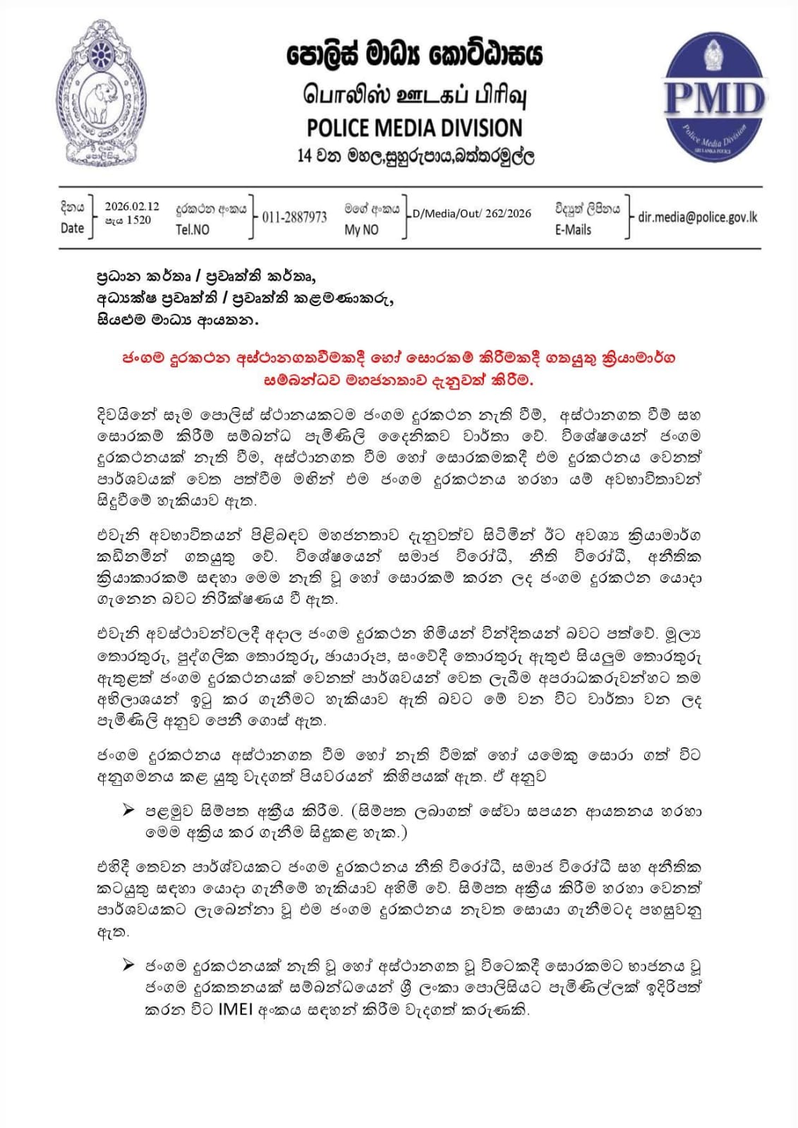 ශ්රී ලංකා පොලීසිය විසින් එලෙස ජංගම දුරකථන අස්ථානගතවීමකදී හෝ සොරකමකදී මහජනතාව ගත යුතු ක්රියාමාර්ග පිළිබඳව දැනුවත් කරමින් ඒ පිළිබඳව නිකුත් කළ නිවේදනය පහතින්,