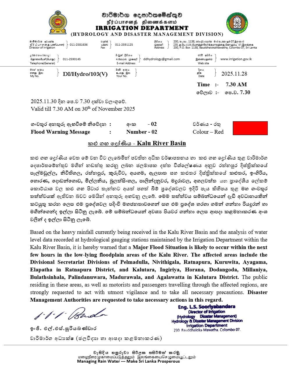 කළු ගඟ ද්රෝණියට මහ ගංවතුර තත්ත්වයක් ඇතිවිය හැකි බව වාරිමාර්ග දෙපාර්තමේන්තුව පවසනවා.