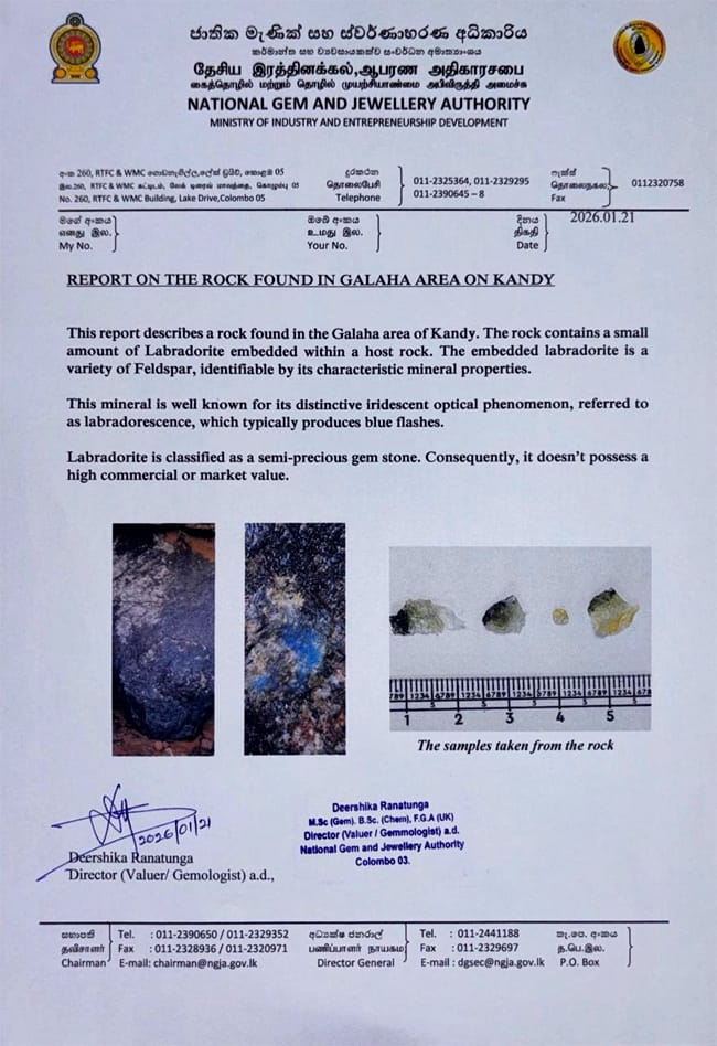එම අධිකාරිය නිවේදනයක් නිකුත් කරමින් සඳහන් කළේ පර්වතය තුළ 'Labradorite' නම් ඛනිජය කුඩා ප්රමාණයක් තැන්පත් වී ඇති බවයි.