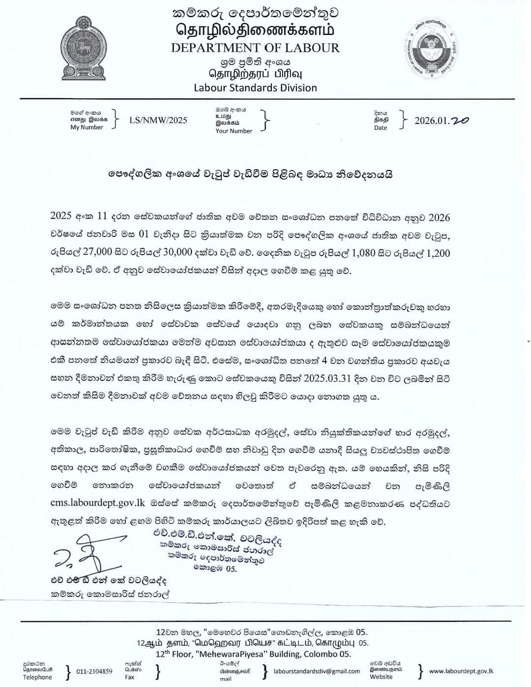 මෙම වැටුප් වැඩි කිරීම 2025 අංක 11 දරන සේවකයන්ගේ ජාතික අවම වේතන සංශෝධන පනතේ විධිවිධාන අනුව වැඩිකර තිබෙනවා.