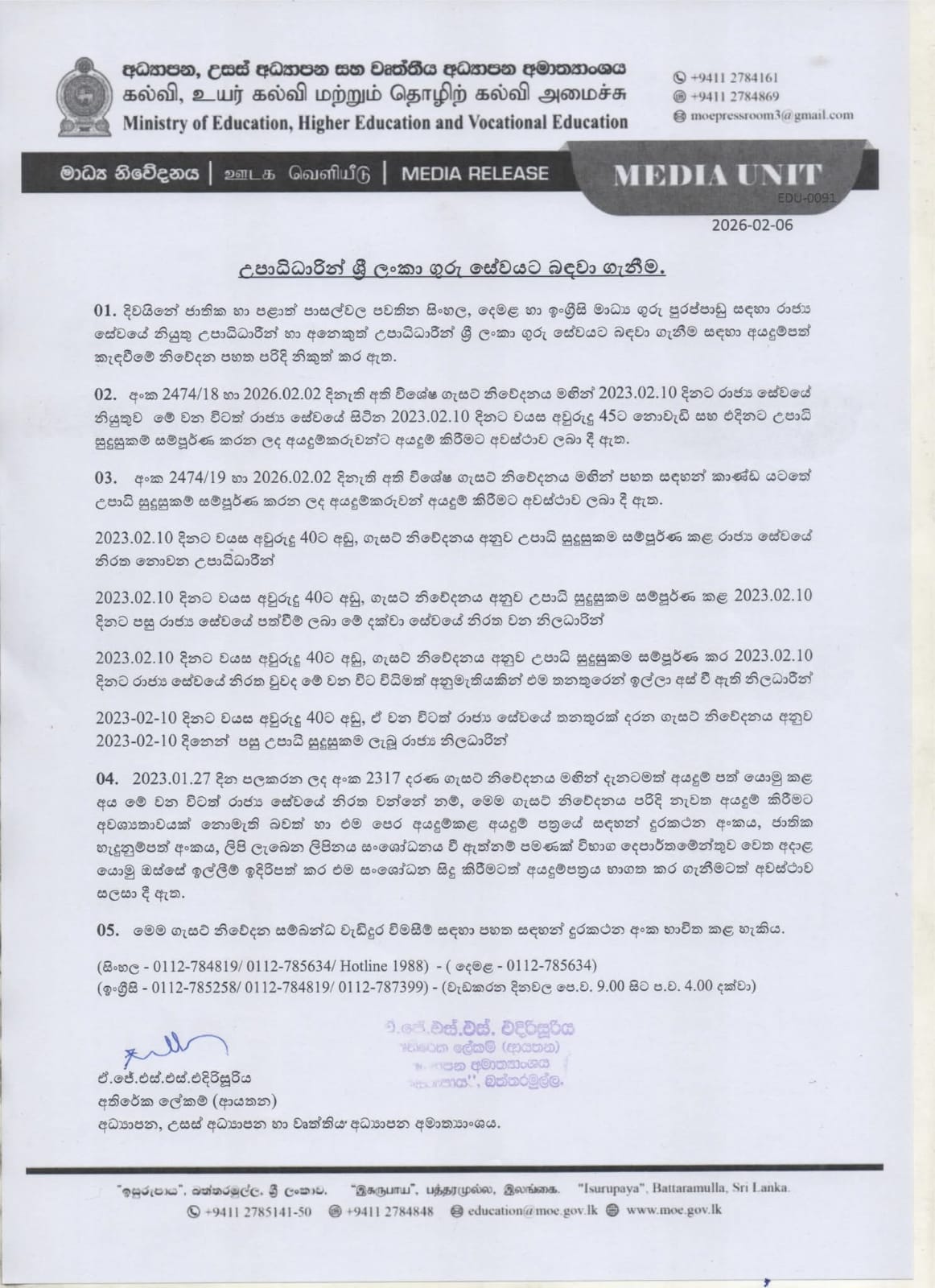 දිවයිනේ ජාතික හා පළාත් පාසල්වල පවතින සිංහල, දෙමළ හා ඉංග්රීසි මාධ්ය ගුරු පුරප්පාඩු සඳහා රජ්ය සේවයේ නියුතු උපාධිධාරීන් හා අනෙකුත් උපාධිධාරීන් ගුරු සේවයට බඳවා ගැනීම සඳහා අයදුම්පත් කැඳවීම සම්බන්ධව අධ්යාපන, උසස් අධ්යාපන සහ වෘත්තිය අධ්යාපන අමාත්යාංශය නිවේදනයක් නිකුත් කර තිබෙනවා.