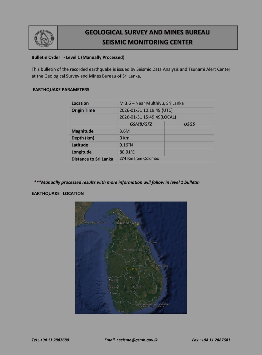 භූ විද්යා හා පතල් කාර්යාංශය සඳහන් කළේ එය රික්ටර් මාපකයේ 3.6ක් ලෙස සටහන් වූ බවයි.