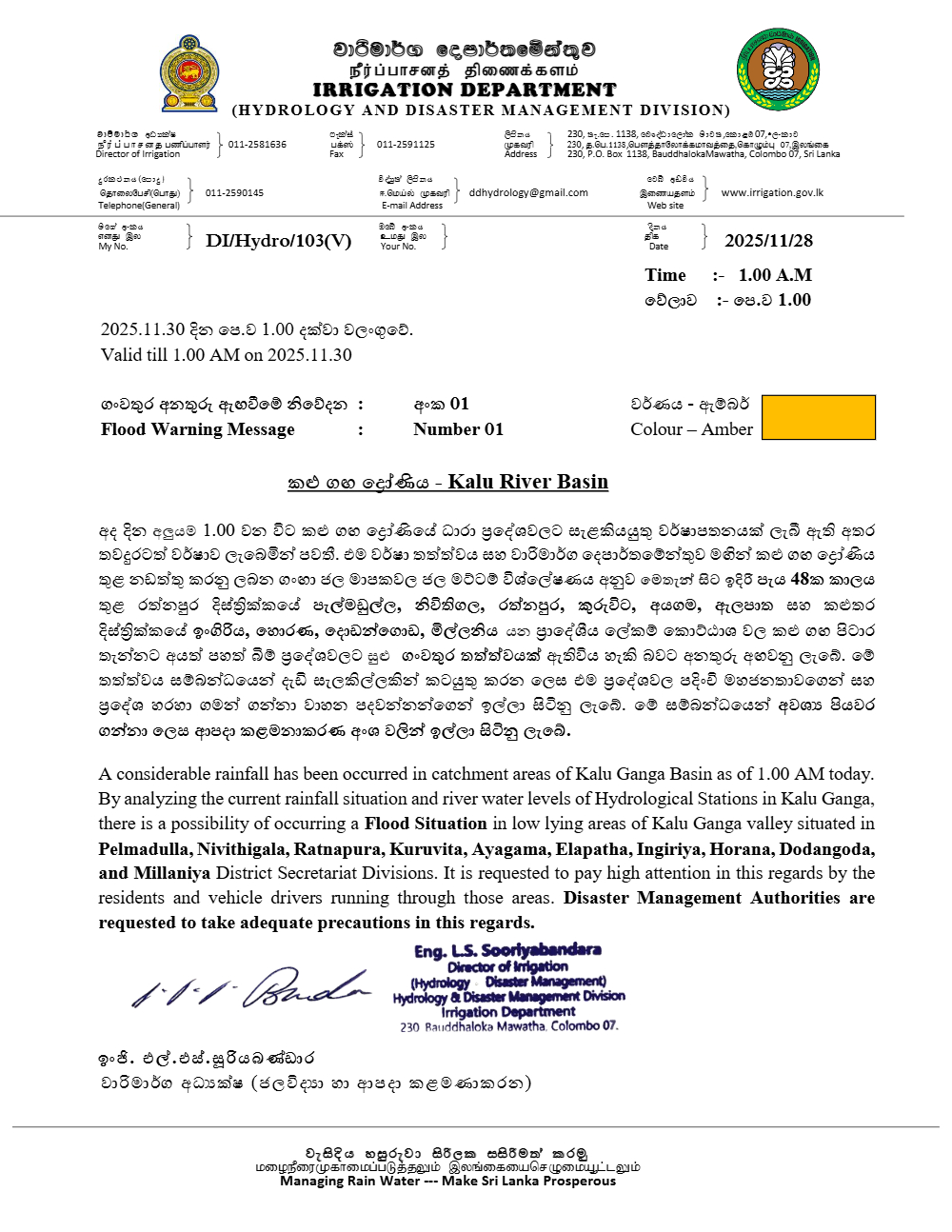ඒ අනුව වර්ෂා තත්ත්වය සහ ගංගා ජල මාපකවල ජල මට්ටම් විශ්ලේෂණය අනුව ඉදිරි පැය 48 ක කාලය තුළ සුළු ගංවතුර තත්ත්වයක් ඇති විය හැකි බවට වාරිමාර්ග දෙපාර්තමේන්තුව අනතුරු අඟවා තිබෙන බවයි සඳහන් වන්නේ.